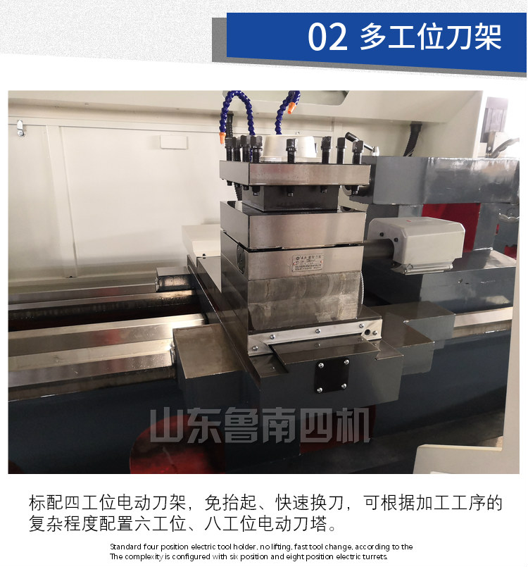 機(jī)床配置國內(nèi)知名品牌立式四工位數(shù)控刀架,刀架具有定位精度高,強(qiáng)度高,抗震性能好等特點(diǎn)。