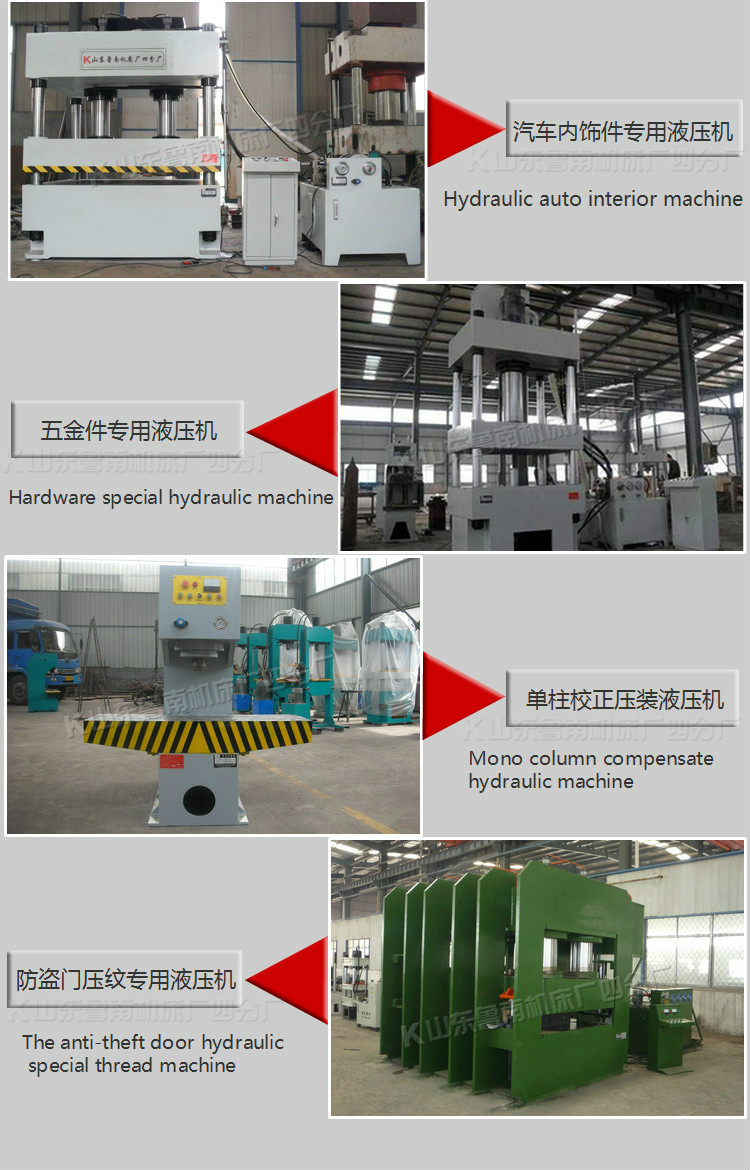 三梁四柱液壓機采用四柱三板式結構,具有獨立的動力機構和電氣系統,采用按鈕集中控制,可實現調整、手動及半自動三種工作方式。動力機構由油箱、高壓泵、控制系統、電動機、壓力閥等部分組成。設備的工作壓力、壓制速度,空載快下行和減速的行程和范圍,均可根據工藝需要進行調整;該液壓機適用于薄板拉伸成型、粉末制品成型、塑料制品成型、冷熱擠壓金屬成型、油箱、底盤、汽車零部件等的橫壓、彎壓、翻透、校正等工藝。