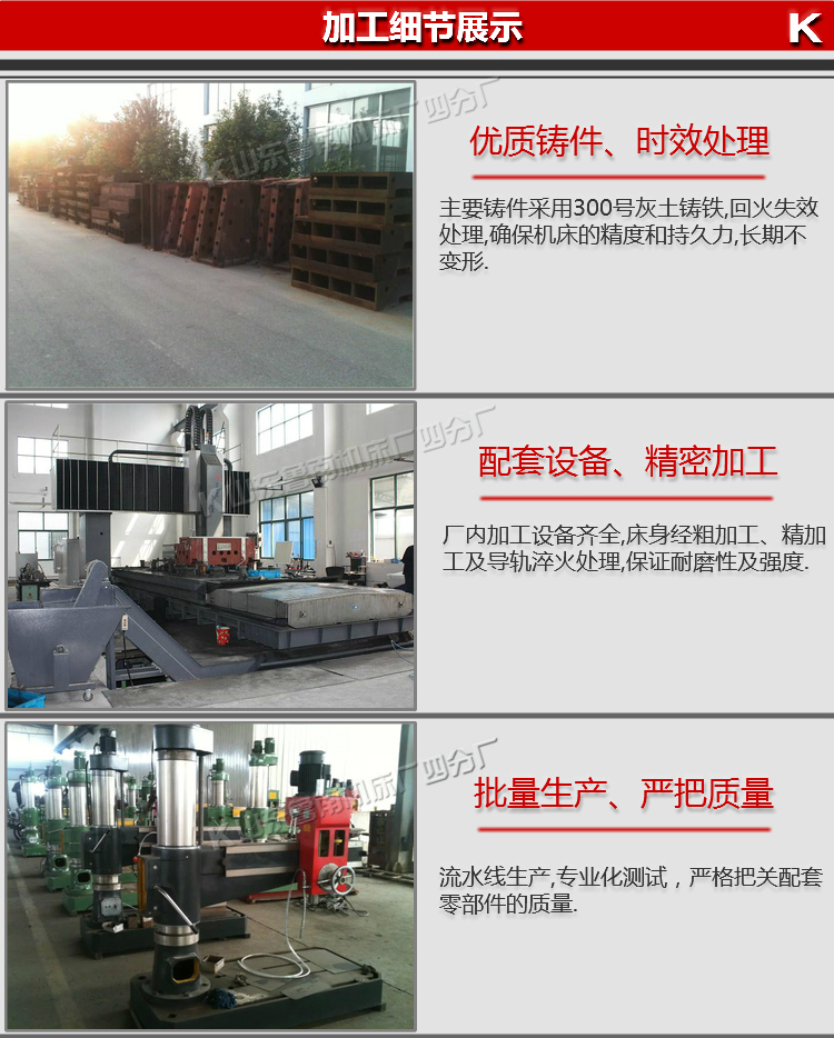 設備機身采用優質樹脂砂鑄造,主要及關鍵部件選用高強度鑄鐵和特供鋼材。搖臂導軌,外柱圓表面,主軸、主軸套筒及內外柱回轉滾道等處均進行了淬火處理,可長期保持機床精度的穩定性,延長了使用壽命。主軸箱、搖臂、內外柱采用液壓驅動的菱形塊夾緊機構,夾緊可靠。有完善的電器安全保護裝置和外柱防護。經過專業化設備連續加工,確保基礎部件精良和較長的使用壽命。